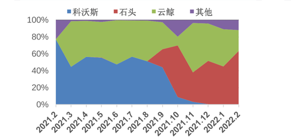 2019年还名不见经传,2020年市场份额飞速提升至10.5%,成为线上TOP5的品牌,与赛道头部石头科技相差不足1%。紧跟着2021年云鲸更是反超石头,成为线上市占率第二的品牌。