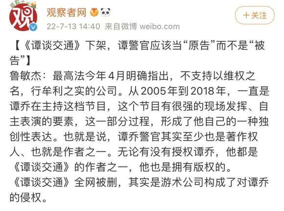 在此基础上,成都广电将相关权利授予给了成都游术,而据上游新闻报道,成都广电内部人士表示,长期以来成都广播电视台对于《谭谈交通》的权利没有进行任何主张,“但这并不代表着电视台方面对于著作权的放弃,谭乔个人通过侵权的行为长期以来获取了大量的利益,这是公认的,并不代表着任何个人可以随便侵权。”