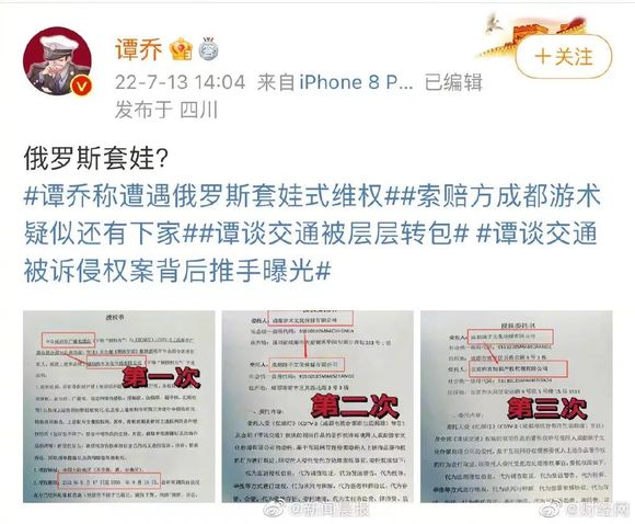 就在昨天,谭乔在微博中po出了三张图片,还带上了遭遇套娃式维权的微博tag。图片显示,此前曾向谭乔索赔的成都游术文化传播有限公司,将从成都广电手中拿到的《谭谈交通》相关权利二次授予了成都妹子文化传媒公司。该公司则如法炮制,将相关权利再度授予给北京析言知识产权代理有限公司。