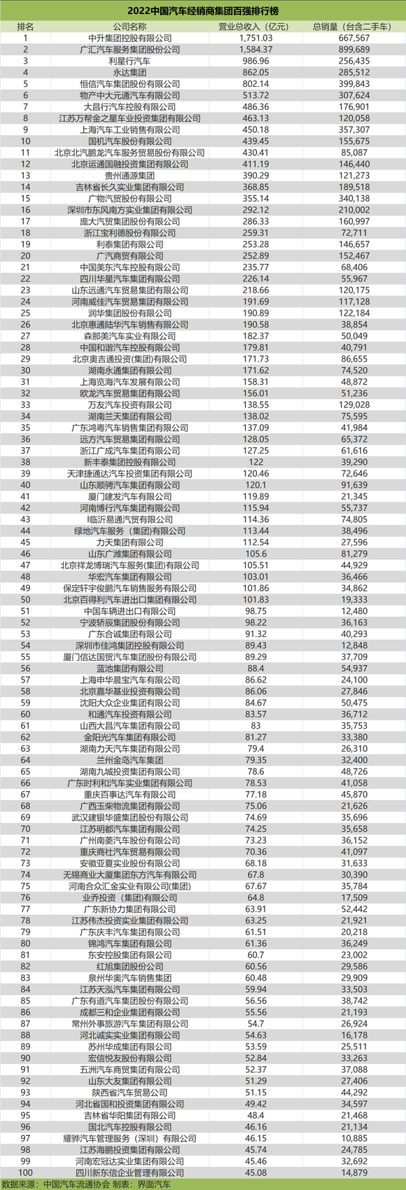 中国汽车经销商集团百强排行榜自2009年开始,已经发布14期,以汽车经销商集团营收规模为排名标准,并由汽车经销商集团自愿申报。