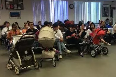 中领馆大厅内有不少小婴儿、手推车,来美生子的父母忙着回国前给孩子办旅行证。