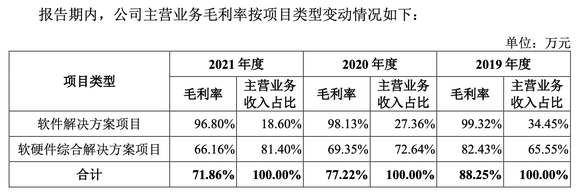 报告期内,公司主营业务毛利率分别为88.25%、77.22%和71.86%,平安城市解决方案业务毛利率分别为88.54%、76.84%和71.84%,毛利率整体下滑,但更能说明公司盈利情况的是两种项目类型的毛利率差异。