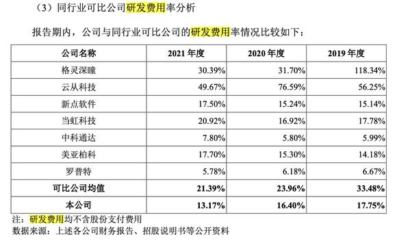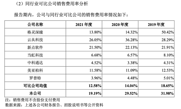 回顾过往的研发情况,报告期内公司的研发费用分别为1766.94万元、2433.13万元及 4882.77万元,而销售费用分别为3184.35万元、4377.81万元、7115.20万元,而与同行相比,公司的研发费用率低于行业均值,销售费用率高于行业均值。