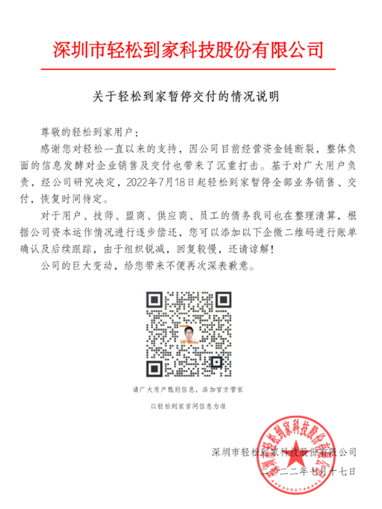 轻松到家表示,因公司目前经营资金链断裂,整体负面的信息发酵对企业销售及交付也带来了沉重打击,决定自2022年7月18日起暂停全部业务销售、交付,恢复时间待定。