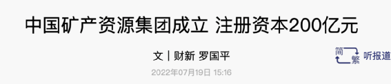7月19日,中国矿产资源集团有限公司工商注册成立,注册资本200亿元,注册地在雄安新区。
