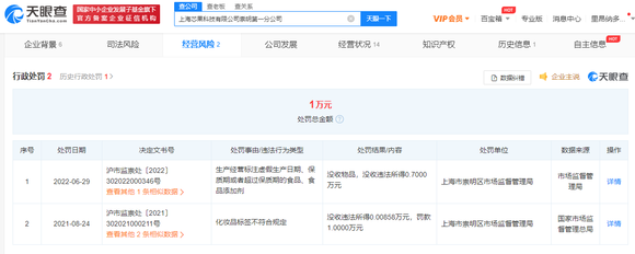 据上海市市场监督管理局消息,近日,上海芯果科技有限公司崇明第一分公司因经营超过保质期的食品,被上海市崇明区市场监督管理局罚款7000元。
