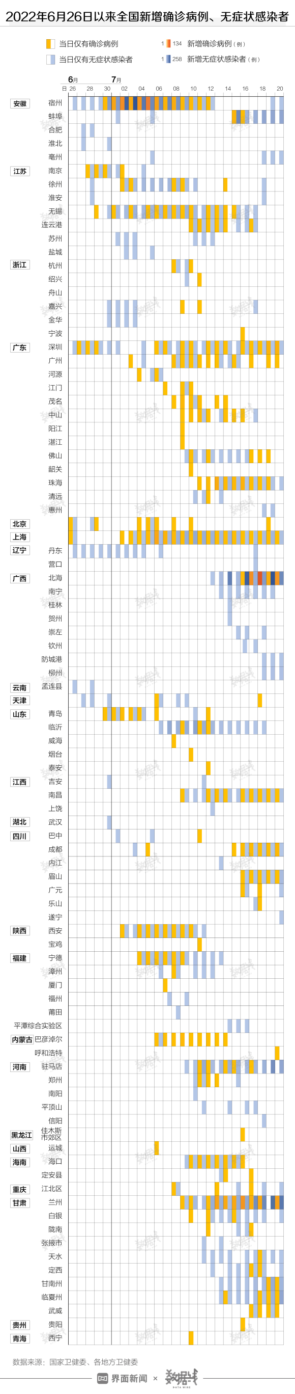 据界面数据统计,6月26日至今,本轮本土疫情确诊病例中,近6成集中在安徽宿州、甘肃兰州、广西北海3地。另有约2成在上海、珠海、深圳、蚌埠、成都5地。