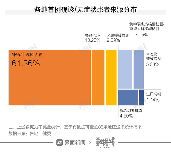 界面数据统计了88条首例确诊病例通报信息后发现,6成以上是“外省/市返回人员”,另有约1成为“关联入境”“区域核酸检测”。此外有约不到1成为“集中隔离点核酸检测/重点人群核酸检测筛查发现”。