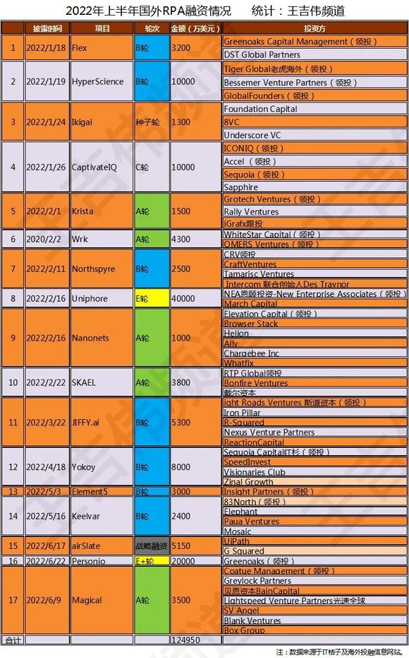 2022上半年全球RPA融资大盘点,24起融资总额104亿元。A+B轮融资占六成,国产RPA进入“C轮时代”。