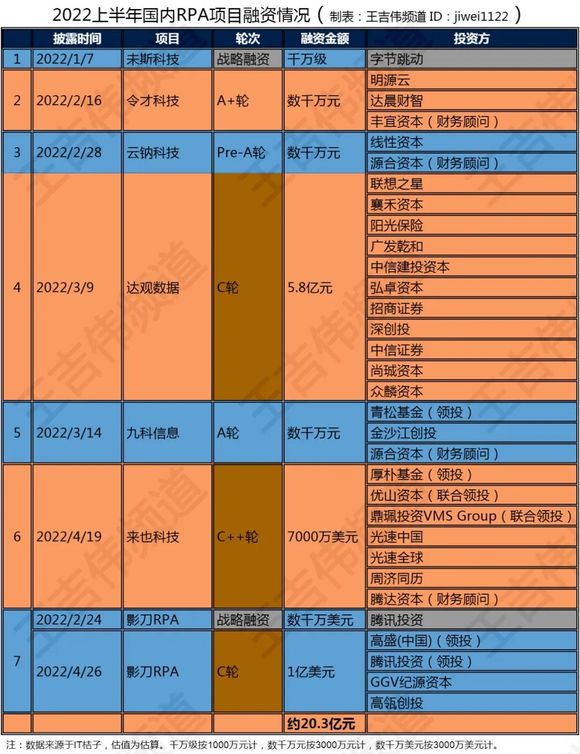 公开数据显示,2022年上半年国内发生7起RPA融资事件。