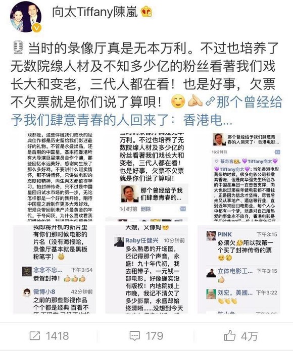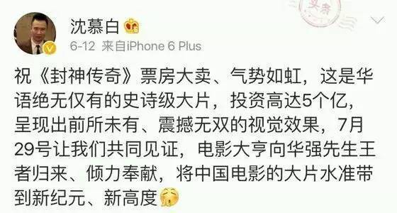 在博纳的官方微信公号居然沿袭了安乐之前对《寒战》的宣发模式,把自己当了一回电影营销号,摒弃官方的原则,做了一回“香港大佬”向华强的迷弟迷妹,大打情怀牌:一篇《那个曾经给予我们肆意青春的人回来了:香港电影大佬向华强重出江湖》等不及收获巨额票房分账的向太早在微博上乐开了花,声称:欠票不欠票你们说了算呗!