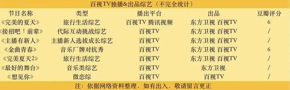2020年8月,百视TV与东方卫视推出了首档合作综艺《完美的夏天》,虽然这档节目没有由百视TV独播,但百视TV针对粉丝群体打造了加更版、明星幕后、未播花絮等独家内容。