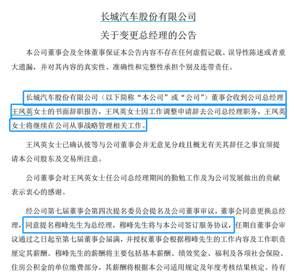 7月24日晚,长城汽车公告,王凤英因工作调整申请辞去公司总经理职务,继续在公司从事战略管理相关工作,而总经理一职则由穆峰担任。