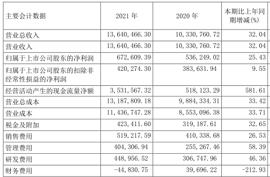 截至2021年年底,长城汽车实现营业总收入为1364.05亿元,同比增长 32.04%;净利润为67.26亿元,同比增长25.43%。