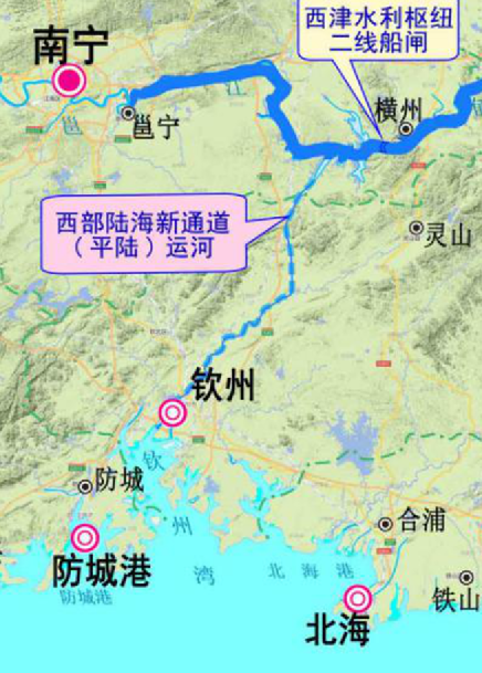 按照规划,该运河全长约140km。线路北起南宁市西津水库的平塘江口。顺着江口的沙坪河一路向南,然后开挖6公里,翻越一道分水岭连接到钦州的旧州江。再经“陆屋镇”,便可沿着钦江干流南下进入北部湾了。