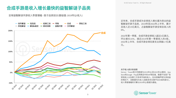 据Sensor Tower数据,2022年上半年,Merge(合成)手游玩家支出突破2.7亿美元,是近年下载量和收入增长最快的益智手游子品类。