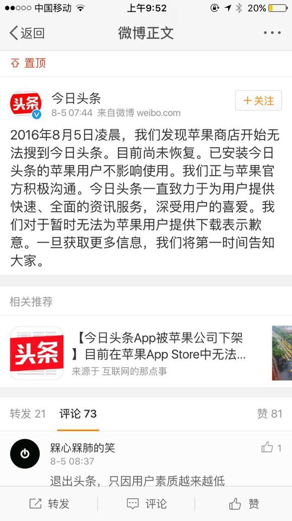 今日头条表示,8月5日凌晨,他们发现苹果商店开始无法搜索到今日头条,目前尚未恢复。但并不影响已经下载了APP的用户使用,现在正在与苹果苹果官方进行沟通。