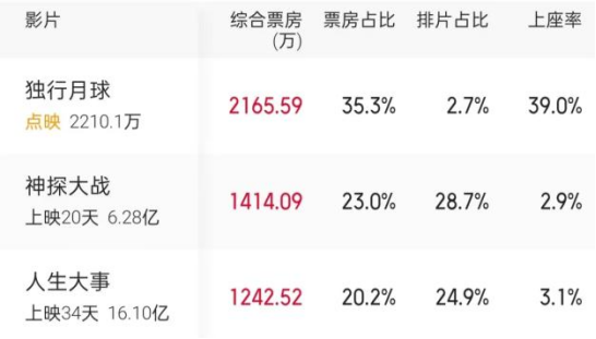 7月27日,《独行月球》点映了八千多场,排片占比仅为2.7%,却凭借场均61的观影人次拿到了2200万的票房,超过排片占比均超20%的《人生大事》与《神探大战》。