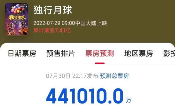 目前猫眼预测《独行月球》总票房44亿