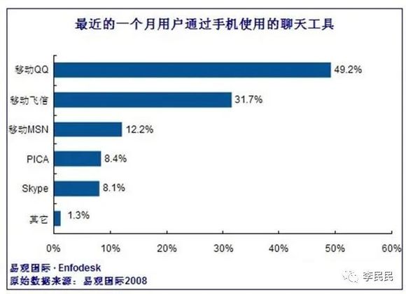 易观国际的《中国大学生即时通讯市场用户调研报告 2008》研究数据显示,67.4%的大学生用户在三个月内有使用过手机即时通讯工具。从市场份额来看,“移动QQ”和“移动飞信”的覆盖率要远远高于其他手机客户端软件,分别有49.2%和31.7%的用户表示在最近三个月使用过“移动QQ”和“移动飞信”。