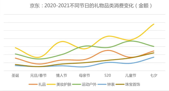 京东数据显示:美妆护肤、礼品(主要指奢侈品)、珠宝首饰是历年七夕销售增长前三的品类。美妆护肤在去年七夕的销售金额已经超过了214情人节和520,排名第一。“七夕”无疑正成为对礼物经济拉动最为明显的时间节点,在美妆市场中的价值也加速提升。