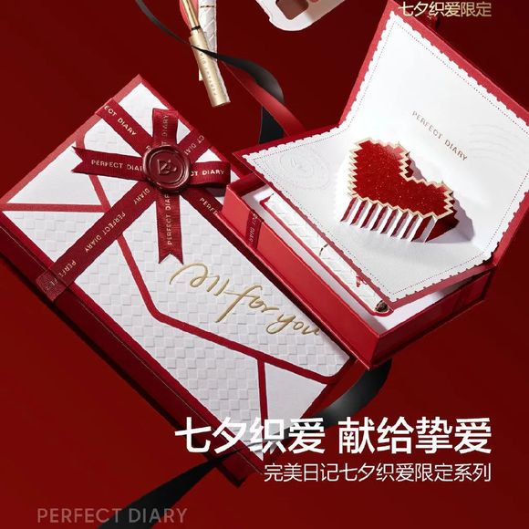 为了放大产品本身的传播声量,也有品牌选择了跨界联名来加分。例如,完美日记“织爱”系列限定礼盒与中国邮政联名,信封造型的礼盒内含立体爱心贺卡设计和DIY贴纸,可进行手写祝福,扫描二维码还能语音留言,再加上限量邮政周边,让表白更有文艺气息。
