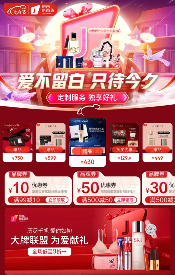 主题为“爱不留白,只待七夕”的京东新百货美妆七夕礼遇季活动已在7月25日开启,并进入销售高峰。据悉,今年无论是参与的品牌商数量,还是新品数量和创新玩法,均超过历史以往。其中参与深度共建“七夕礼遇季”的美妆大牌数量同比去年翻倍。