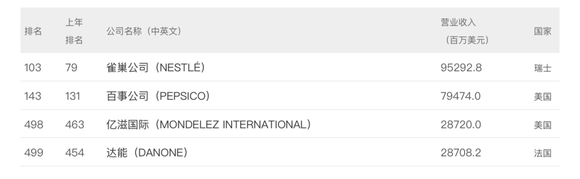 只有4家跨国食品公司上榜,分别是:雀巢、百事、亿滋国际、达能。