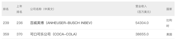 小食代检索发现,和去年一样,位列第一和第二的依然分别是酒精饮料和非酒精饮料各自的“老大”——百威英博和可口可乐。其中,百威英博的营收为543.04亿美元,同比增长14.7%;可口可乐的营收为386.55亿美元,同比增长17.1%。在总榜单中,百威英博今年排第239名,比去年略微下降了3名;而可口可乐排第359名,上升了11名。