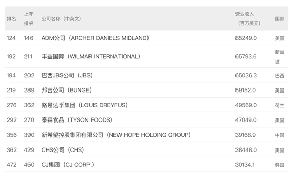 根据上述子榜单显示,除了ADM公司依然稳居榜单外,接下来的排序对比上年在内部发生了变动,今年依次是:丰益国际、巴西JBS公司、邦吉公司、路易达孚集团、泰森食品、新希望控股集团有限公司、CHS公司、以及今年新划分在这一子榜单上的CJ集团。