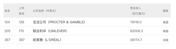 据《财富》榜单显示,出现在“家居、个人用品”的联合利华,今年以620.063亿美元的营收在500强中排名205,对比上年下滑了30名。该公司旗下经营着和路雪、梦龙、可爱多、家乐、植卓肉匠等食品品牌。