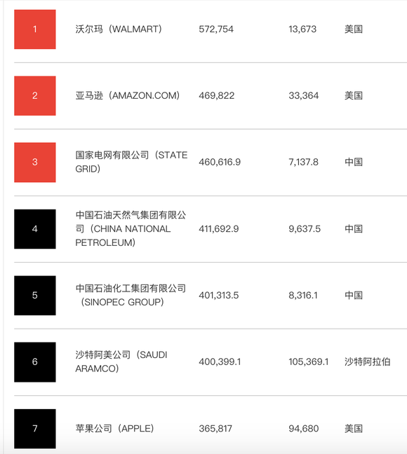 值得注意的是,中国上榜企业的营收占500家上榜企业总营收的31%,首次超过美国。美国上榜企业占上榜企业总营收的30%。榜单前五名中,三家企业来自中国,分别是国家电网、中石油、中石化。