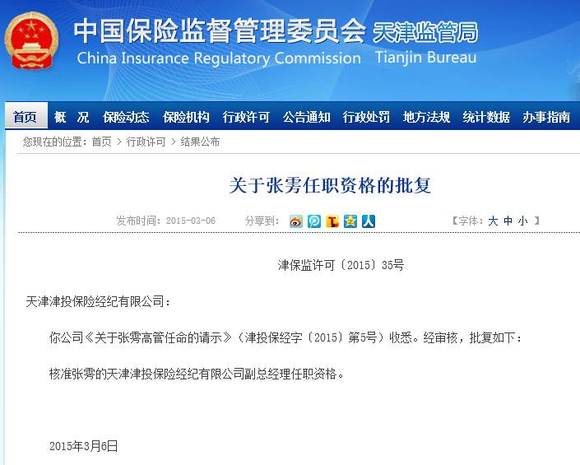 保险公司执行董事是需要保监会批准,才有任职资格的,于是侦探君真的去保监会网站上查询了一下,果然找到了张雱任职资格的批复。这家天津津投保险经纪有限公司是家什么公司呢?首先,这是一家有保险经纪牌照的公司,不过保险经纪牌照可能是整个金融圈最不值钱的牌照了,很好拿,市场价也很便宜,大约在500万—1000万就能买一张。