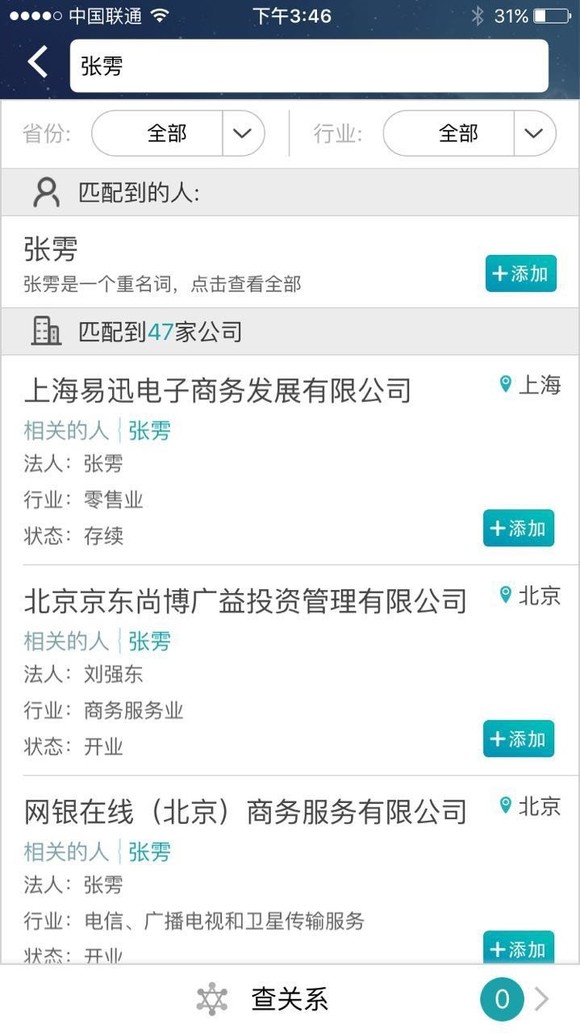 52家股东或者法人代表的统计,侦探君未能核实到,依据天眼查APP的工商资料显示,张雱担任法人代表或者股东的公司有47家。绝大部分为处于存续期内的京东各类关联公司。