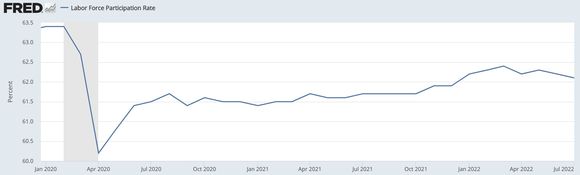 7月就业报告中最令外界失望的数据,依然是进一步下跌至62.1%的劳动力参与率,为今年来最低水平,且距离疫情爆发前的高点63.4%仍有距离。