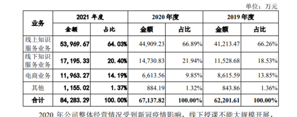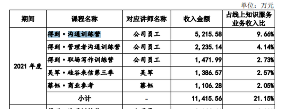 在2019—2021年期间,分别有95.75%、96.8%、98.48%课程收入来自知识产权归属公司所有或者是由公司与创作者共有的课程。并且,在2021年收入贡献前五大课程中,有三门都是来自公司员工主讲,累计收入0.89亿元。在2019-2020年,收入贡献前五大课程中基本全部为名师课程。
