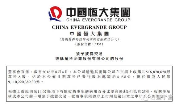 这不,昨日中国恒大出公告称收购万科4.68%的股权,总斥资约91.1亿元,直逼举牌线,将万科A拉上了涨停板。
