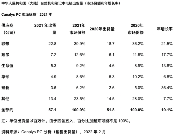 大型PC厂商也都吃到了疫情红利,联想在2021年出货量年增长率高达21.5%,宏碁更是交出了36.4%的年增长率数据。