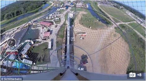 游客需要爬上264级台阶,坐在3人座的水筏上,腰部和肩部被固定在船筏上,然后以65英里(104公里)的时速,从168英尺(约51米)高处一溜而下至最低点。