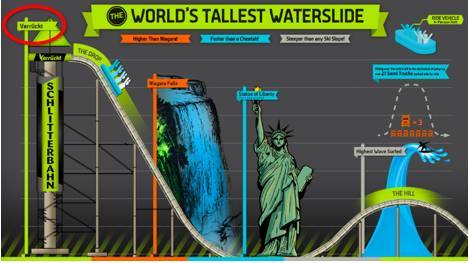 滑梯高度近17层楼,已远超尼亚加拉大瀑布和自由女神像的高度。在这样速度和高度难怪被列为吉尼斯世界记录中「世上最高的滑水道」,也一直稳列全球主题乐园的最恐怖滑水道排行榜!