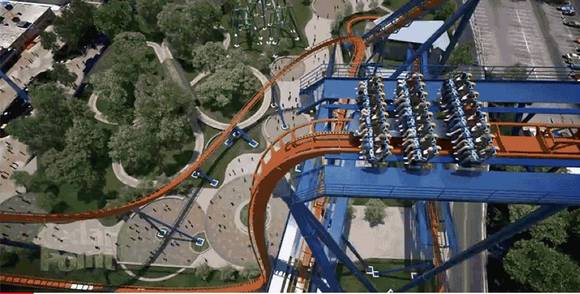 蝙蝠车的轨道有两个360度大旋转,最惊险过程是从相当11层楼的高度快速俯冲到地面。