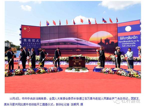 图4.2015年12月2日,连接老挝首都万象与云南昆明的中老铁路老挝段(磨丁至万象)举行开工奠基仪式。通过万象连接曼谷,即很大程度实现了我国的中线战略 图片来源|新华社