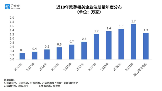 企查查数据显示,全国殡葬相关企业总量12.9万家,现存10.1万家。2021年新注册1.7万家,同比增加16.1%;截至8月初,殡葬相关企业新注册数量1.3万家。