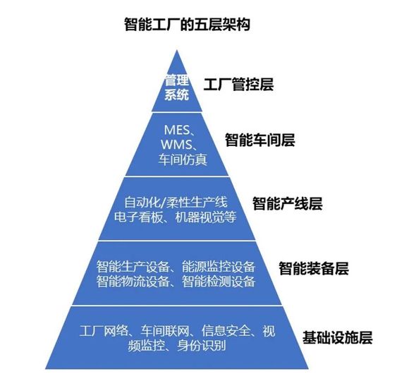 智能工厂的架构分为5个层面,自下而上分别为基础设施层、智能装备层、智能产线层、智能车间层和工厂管控层。