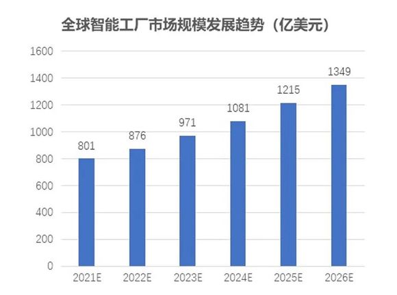 从全球来看,智能工厂系统集成市场持续增长,据Markets and Markets发布的报告显示,预计2021年全球智能工厂市场规模预计达到801亿美元,到2026年这一数据有望增至1349亿美元,期间年复合增长率达到11%。