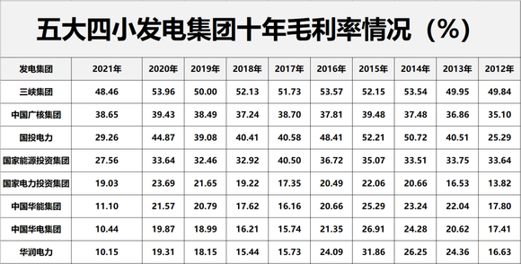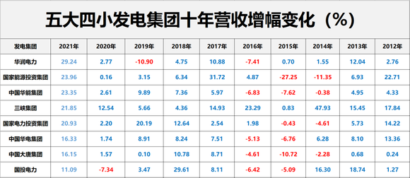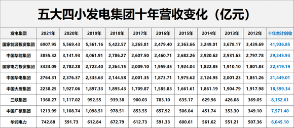 从增速看,十年间“五大四小”年度营收规模增长了72.10%,其中3大发电集团增速在100%以上,依次是三峡集团,增长268.59%;中国广核集团,增长247.75%和国家能源投资集团,增长100.83%。