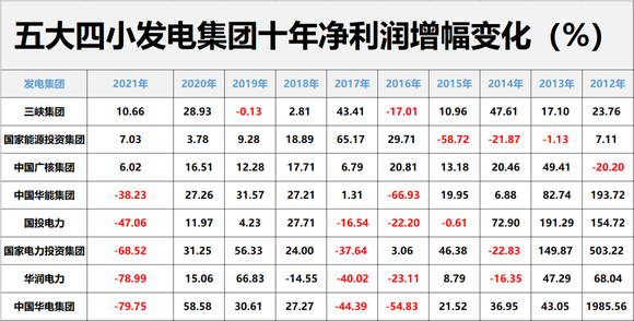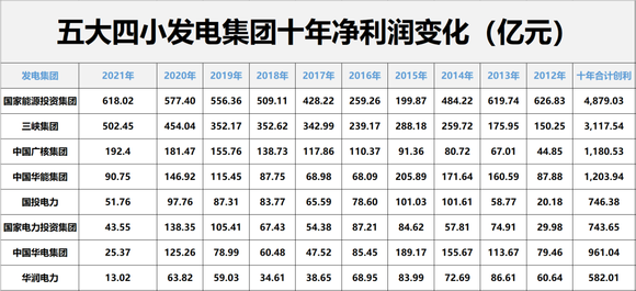 近十年间,五大四小发电集团合计创造净利润1.38万亿,其中4家发电集团创利超1000亿元,依次为国家能源投资集团,合计创利4979亿元;三峡集团,合计创利3118亿元;中国华能集团,合计创利1204亿元;中国广核集团,合计创利1181亿元。