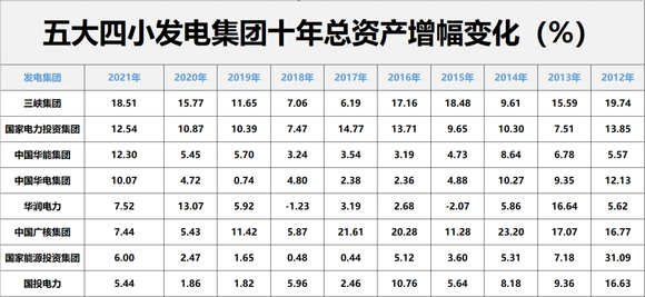 截止2021年末,五大四小发电集团总资产合计为8.99万亿元,较十年前增长105.60%。其中,国家能源投资集团、国家电力投资集团、中国华能集团、三峡集团总资产规模均超万亿。