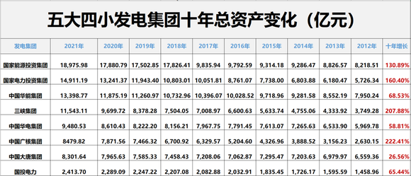从增速看,其中7大发电集团总资产都已超10年以上持续增长;十年间4大发电集团总资产规模增长在100%以上,依次为中国广核集团,总资产增长222.41%;三峡集团,总资产增长207.88%;国家电力投资集团,总资产增长160.40%;国家能源投资集团,总资产增长130.89%。