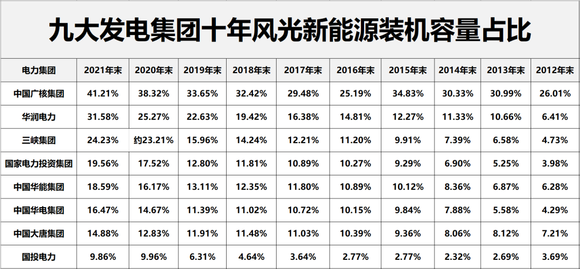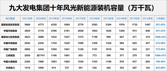以下是本期内容及相关表格的呈现顺序,供读者参考:(注:基于电力央企整合重组的变化,本文表格中,国家能源集团2012-2017年数据为原中国国电集团数据,2018-2021年为原中国国电集团与神华集团合并后数据;中国广核集团2012年-2016年风电和太阳能数据分别为2011年11月末、2012年9月末、2014年3月末、2015年3月末、2016年3月末、2016年9月末数据。除华润电力装机容量为权益装机容量外,其他发电集团均是控股装机容量)。